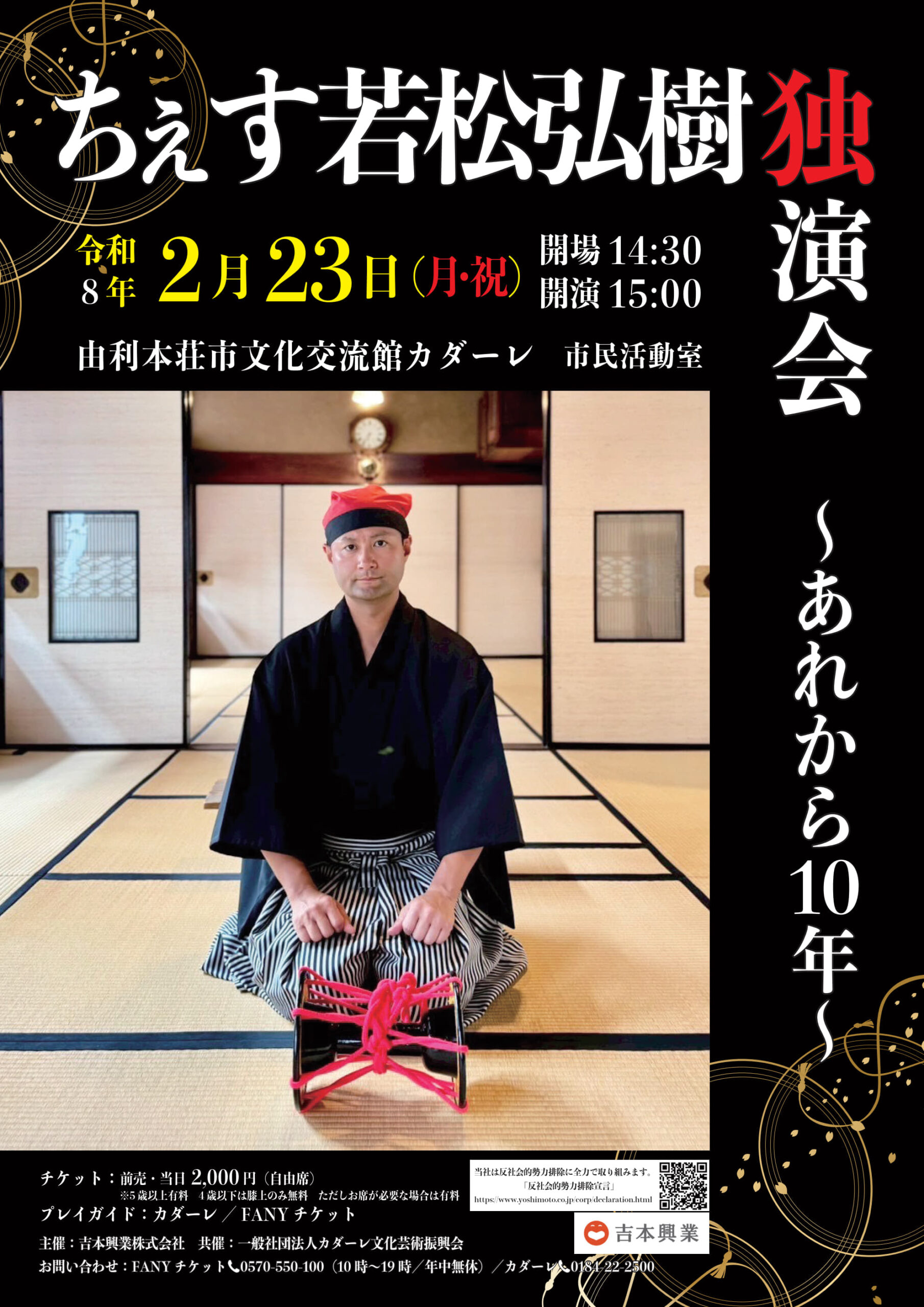 由利本荘市を拠点に活動する秋田よしもとの芸人、ちぇす若松弘樹さんが、カダーレで初の単独ライブを開催します!普段のコンビ活動では見ることのできない独演会ならではのネタと、ここでしか聞けないトークを存分にお楽しみください!